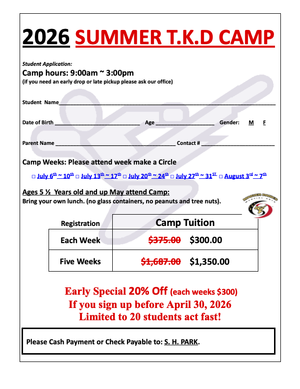 Whether your child is actively a student or not, kids 5 ½ and up are welcome to join us for 5 weeks of summer fun! Tae Kwon Do Camp is a great way to keep your child sharp over a school break. Instead of watching television or playing video games, your children can build their bodies and minds through martial arts while having fun in a safe and inclusive space!